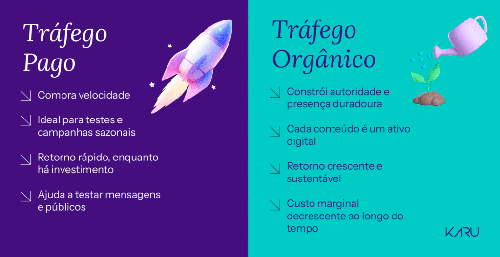 O tráfego orgânico, por outro lado, constrói um ativo. Cada conteúdo de qualidade, otimizado para SEO e GEO, funciona como um investimento imobiliário digital: exige um aporte inicial (tempo e recurso), mas seu valor tende a crescer e gerar “aluguéis” (tráfego e leads) de forma contínua, com custo marginal decrescente.