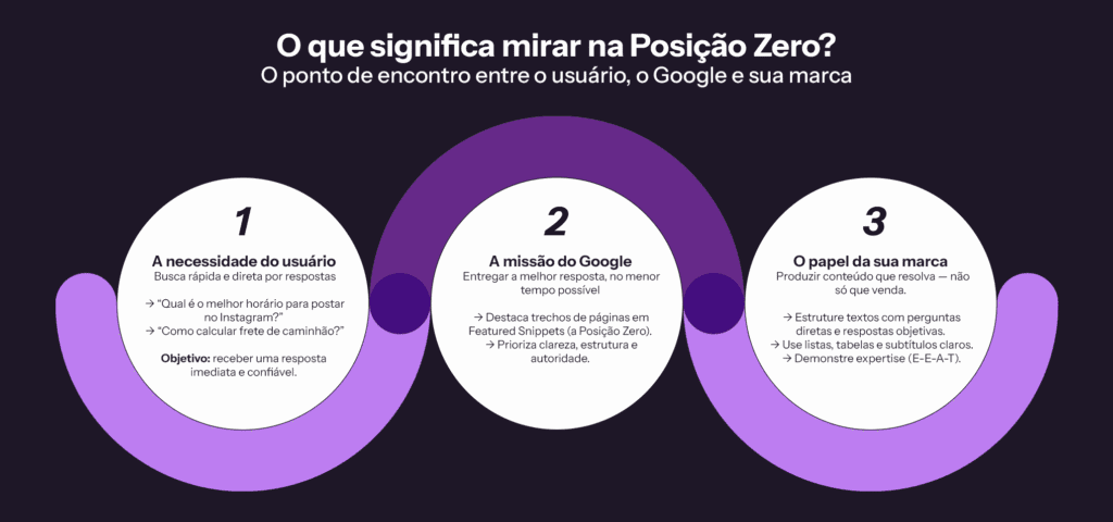 A Posição Zero (ou featured snippet) é a resposta direta do Google a esse fenômeno. O buscador entendeu que, para continuar relevante, ele precisava se tornar um “motor de respostas”, e não apenas uma lista de links genéricos.
