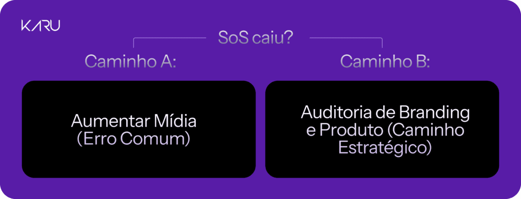 Quando o Share of Search cai, você deve auditar imediatamente a saúde da sua marca e a relevância do seu produto, em vez de apenas aumentar o lance em palavras-chave pagas.